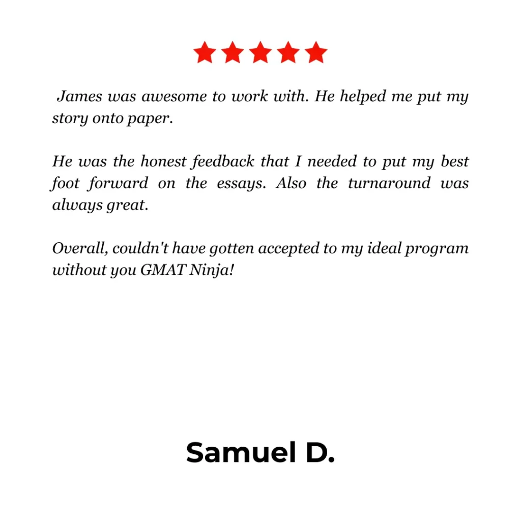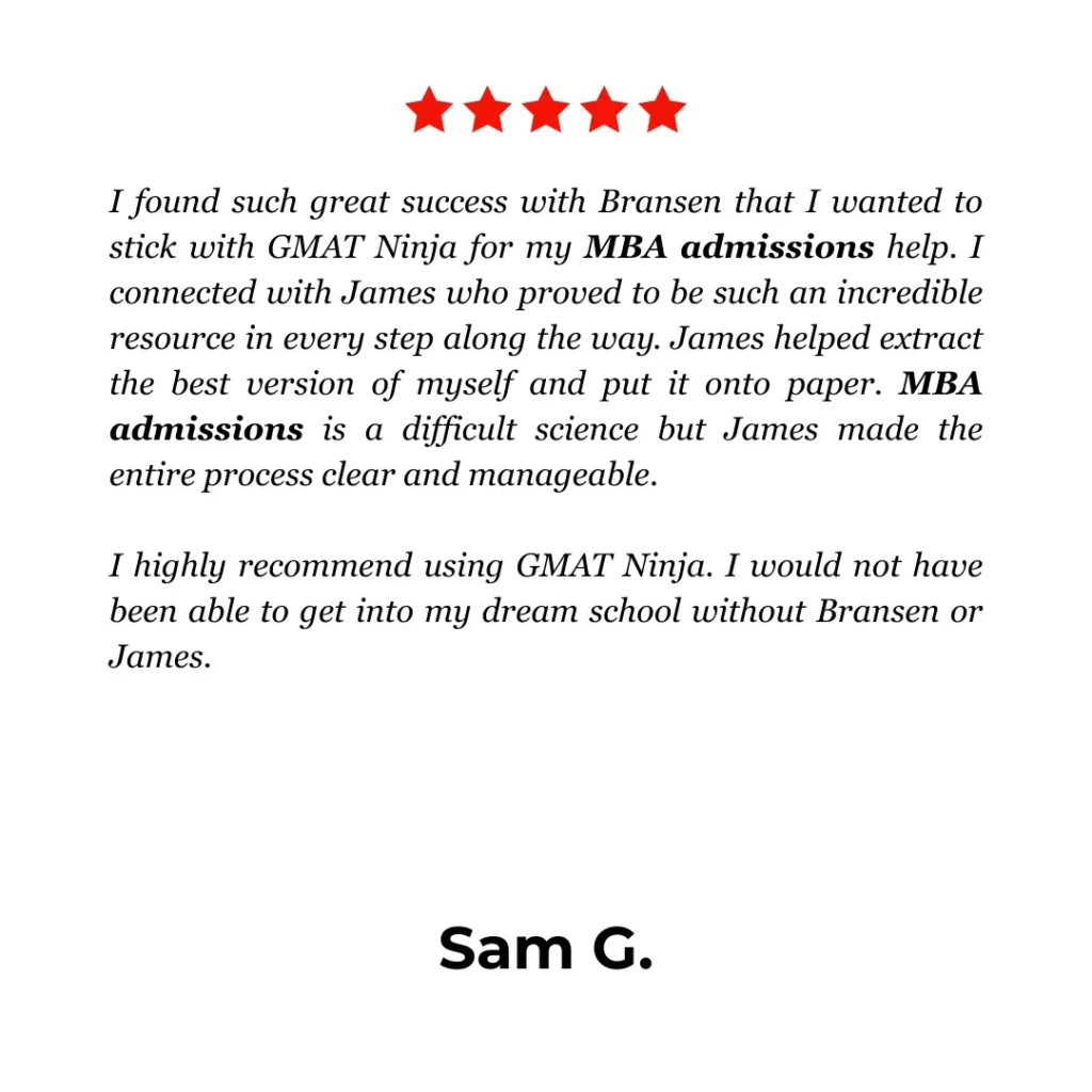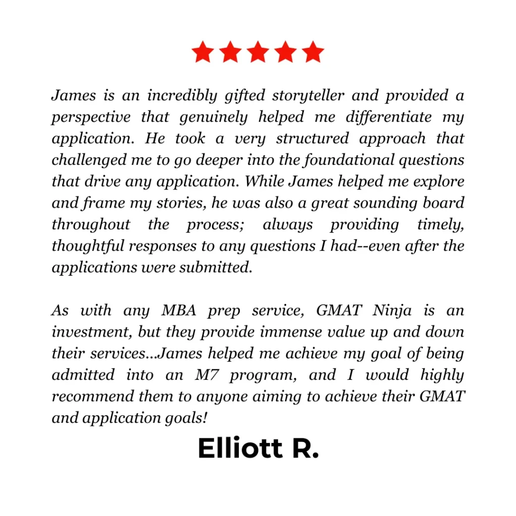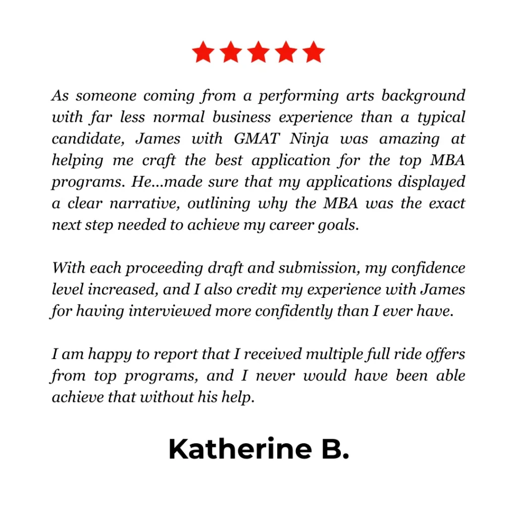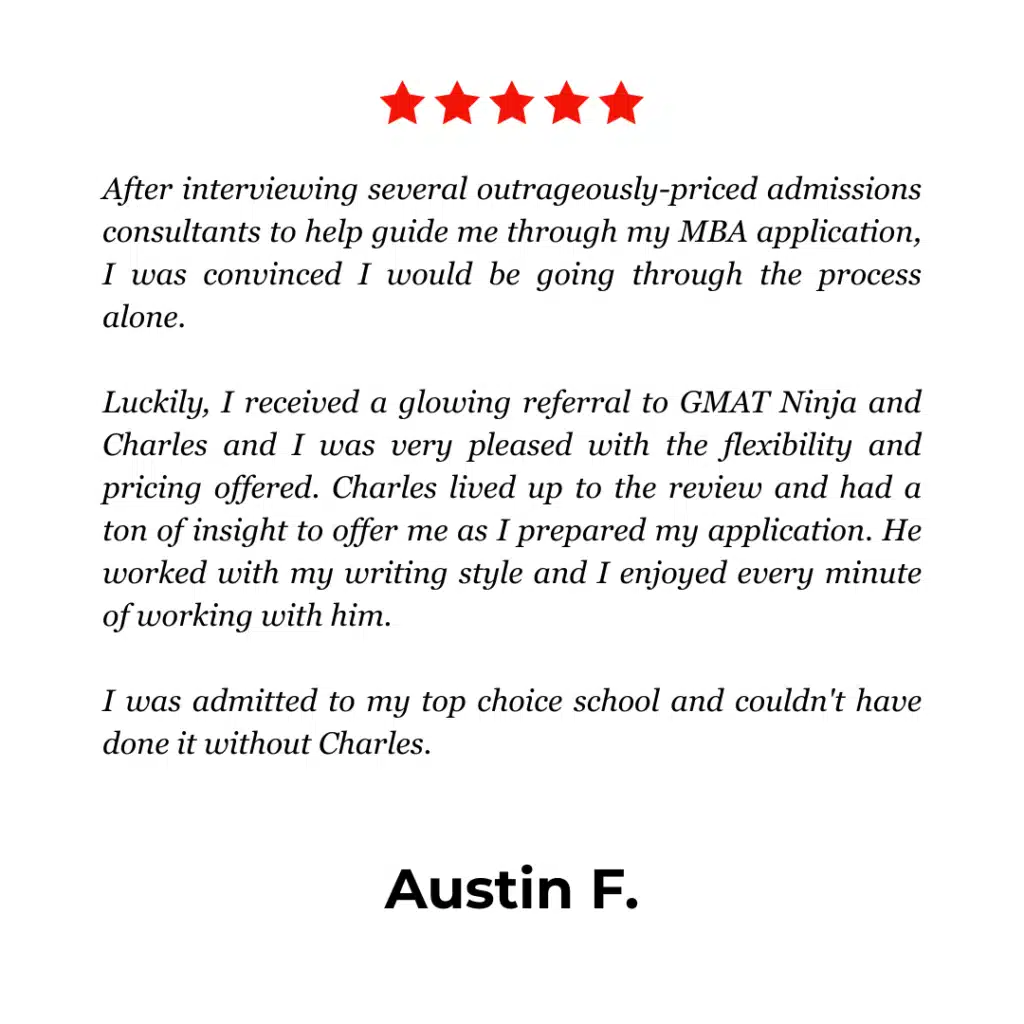 Unlike many admissions firms, GMAT Ninja employs no salespeople at all. Our consultants are writers, educators, and strategists who specialize in clear, powerful communication.