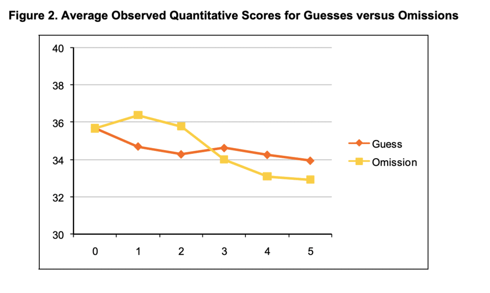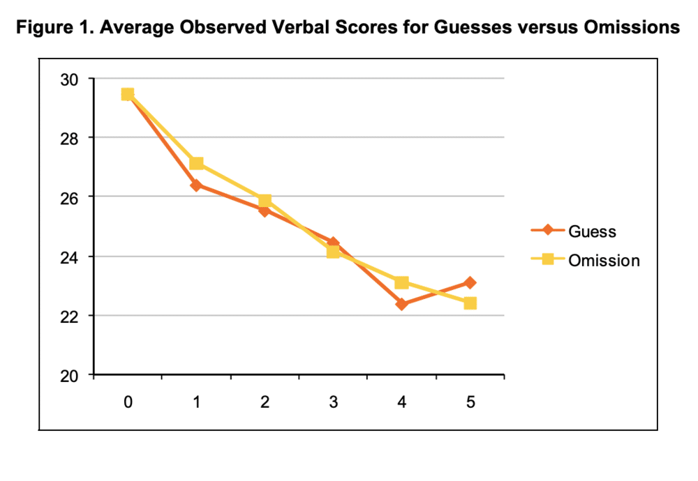 I wouldn’t overthink this data. The bottom line is that under some circumstances, guessing might actually be worse than omitting questions on quant — and either way, the difference isn’t huge.