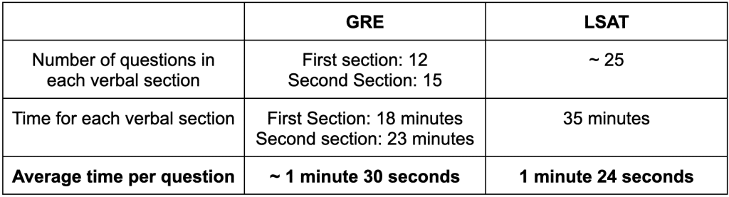 On the surface, the average time allotted for each verbal question on the GRE and LSAT® looks pretty similar: