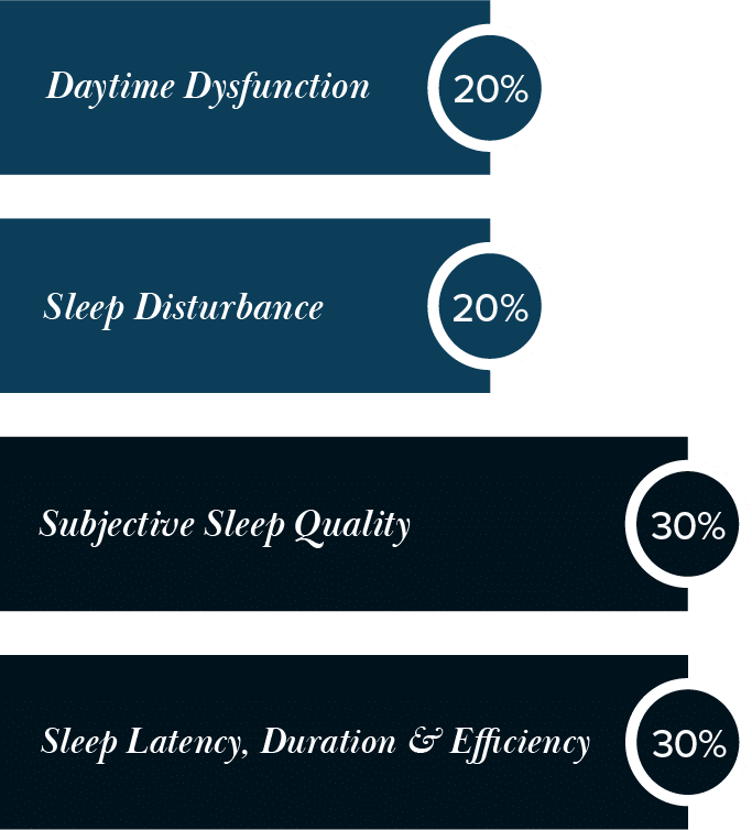 Sleep Latency, Duration, and Efficiency (30%): How long it takes you to fall asleep; how long you sleep each night; and the ratio of total sleep time to the amount of time you spend in bed.